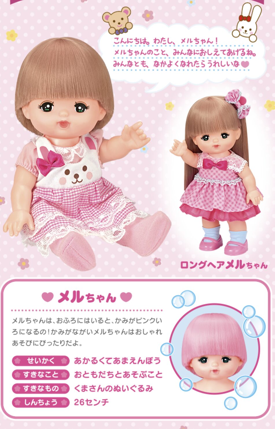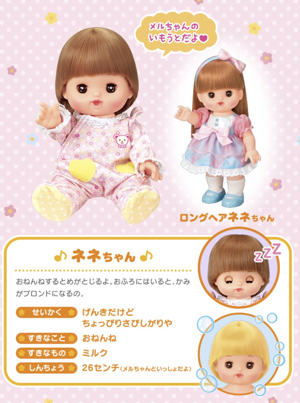 なお、メルちゃんはお風呂に入ると髪がピンク色に、ネネちゃんはイエロー(ブロンド)になる点もおもちゃの設定と同じです。