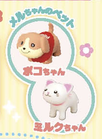メルちゃんシリーズには「ミルクちゃん」という猫のペット、「ポコちゃん」という犬のペットがいます。