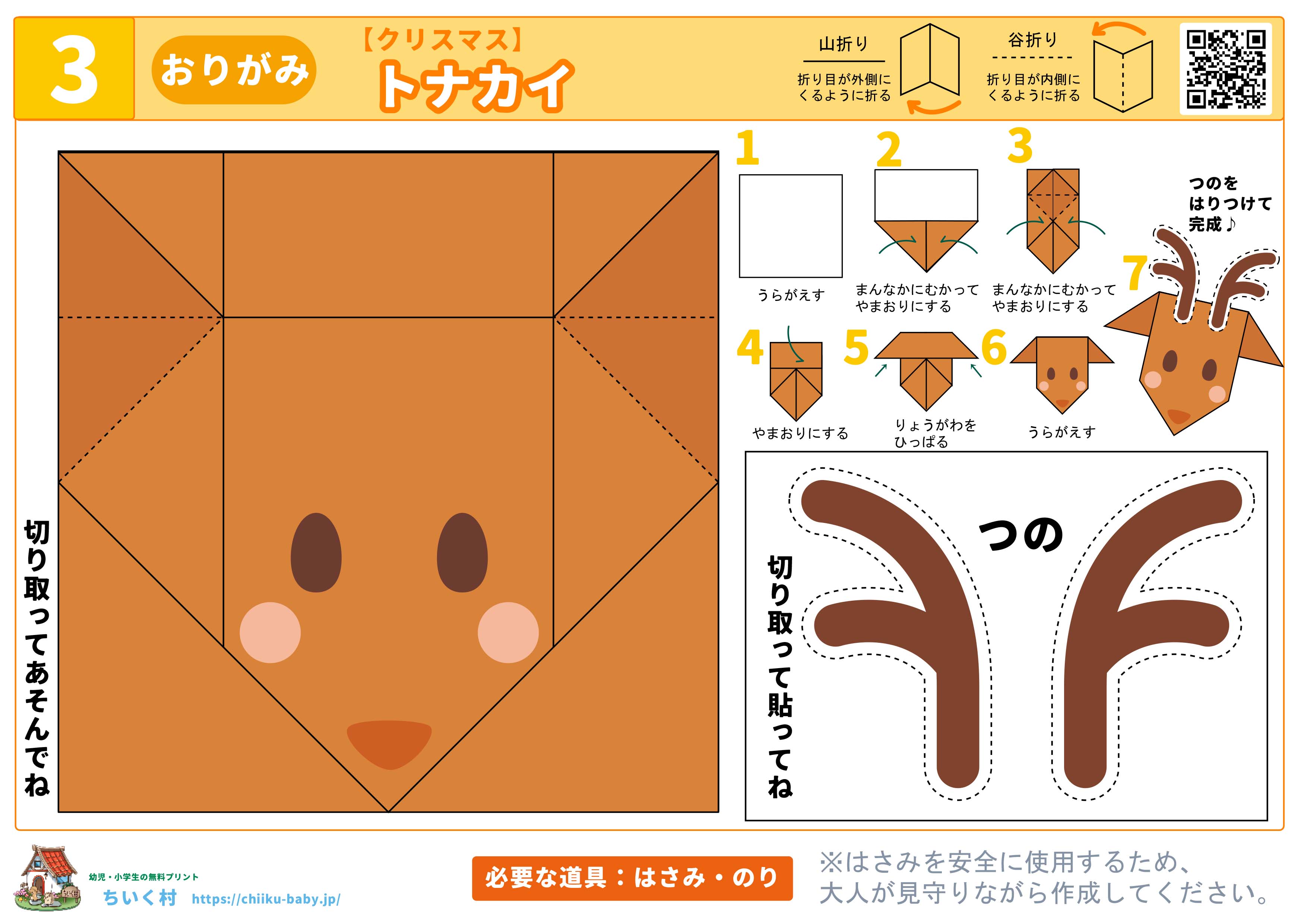 幼児でもできるクリスマスの折り紙(おりがみ)2つ目は、トナカイです。