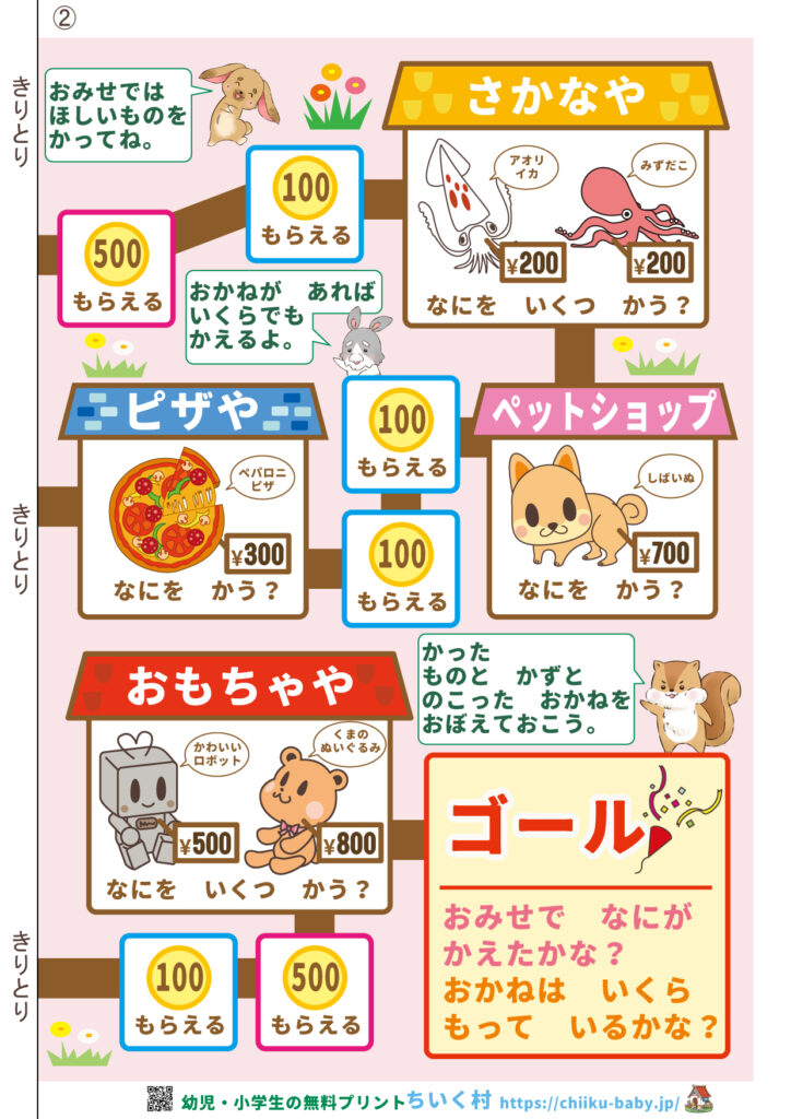 かいものをしながらゴールを目指す知育すごろくです。楽しくお金の計算や使い方を学ぶことができます。